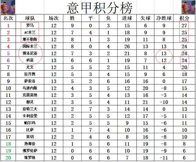 積分榜方面,羅馬2分優勢領跑,AC米蘭,那不勒斯緊隨其後,AC米蘭1個凈勝球優勢排在第2。科莫這波11輪不敗後,先賽的他們暫時追上國米和博洛尼亞,凈勝球劣勢還是排在第6,不過他們多尤文4分,第6的位置是坐穩瞭。