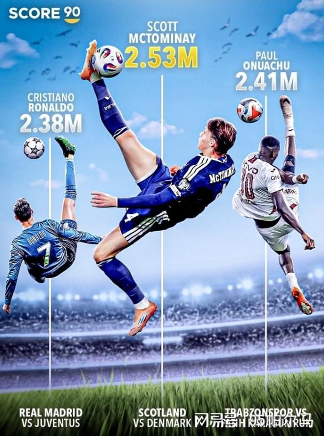 最近一次的英雄主義體現在對陣丹麥的世預賽中,蘇格蘭拿到瞭2026年世界杯資格,麥克托米奈打進瞭一粒美如畫的倒鉤,值得一提的是,他在倒鉤瞬間腳尖高度達到瞭驚人的2.53米,超越瞭奧努阿楚的2.41米和C羅的2.38米,一舉刷新瞭足球史上最高倒鉤進球紀錄。