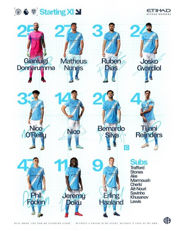 曼城首發:25-多納魯馬、27-馬特烏斯-努內斯、3-魯本-迪亞斯、24-格瓦迪奧爾、33-尼科-奧賴利、14-尼科-岡薩雷斯、20-伯納多-席爾瓦、4-賴因德斯、47-福登、11-多庫、9-哈蘭德