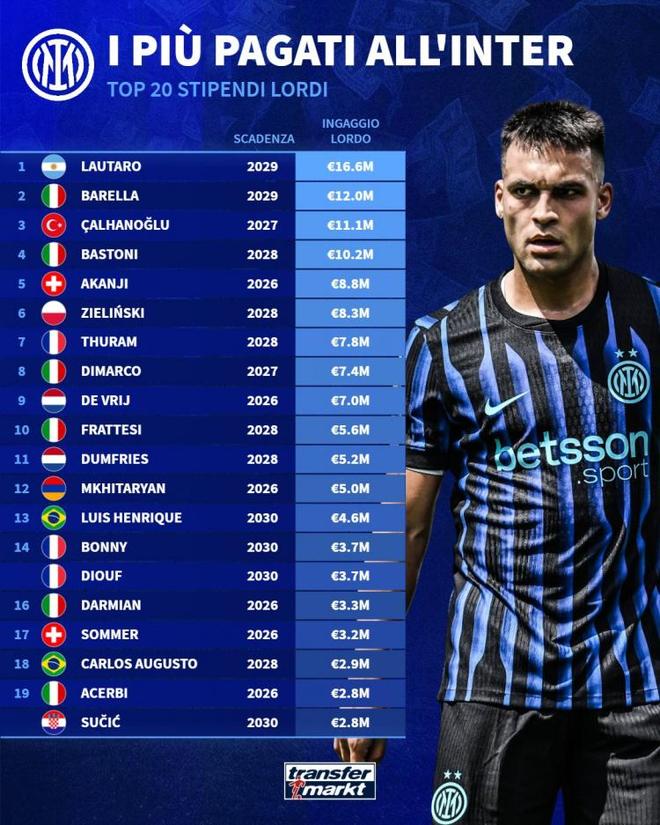 德國轉會市場統計瞭國米球員的稅前年薪列出榜單的,勞塔羅1660萬歐居首的,巴雷拉、恰爾汗奧盧二三位的。