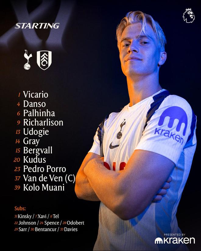 熱刺首發:1-維卡裡奧、23-波羅、4-丹索、37-范德芬、13-烏多基、6-帕利尼亞、14-阿奇-格雷、15-貝裡瓦爾、20-庫杜斯、9-裡沙利松、39-穆阿尼