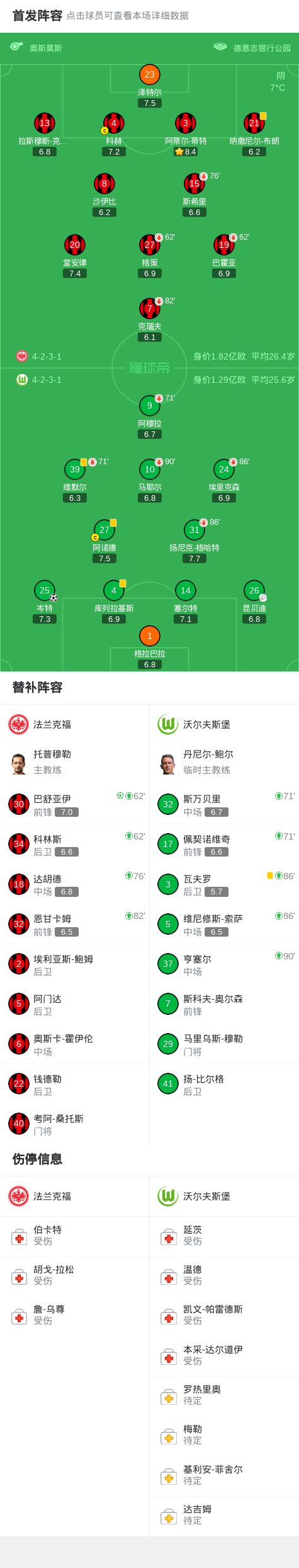 法兰克福1-1沃尔夫斯堡,岑特打破僵局,巴舒亚伊扳平比分