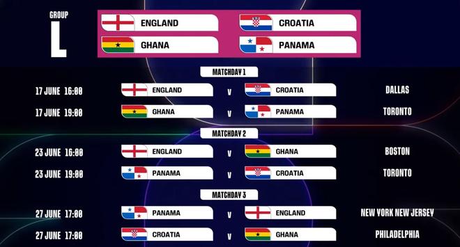 世界杯L組賽程:首戰英格蘭vs克羅地亞6月18日6時打響