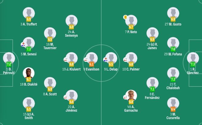 切爾西首發:1-桑切斯、3-庫庫雷利亞、23-查洛巴、27-古斯托、24-詹姆斯、29-福法納、8-恩佐、10-帕爾默(58'20-若昂-佩德羅)、49-加納喬(77'41-埃斯特旺)、7-內托、9-德拉普(32'38-吉烏)