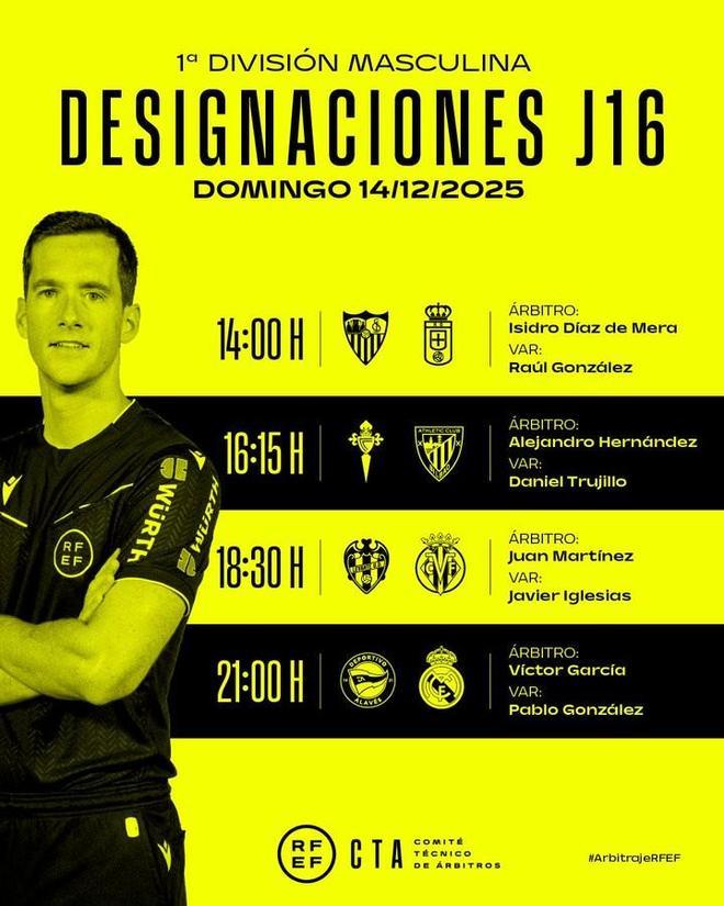 北京时间12月13日,西班牙足协公布了西甲第16轮明日4场比赛的裁判名单,维克托-加西亚执法皇马客战阿拉维斯。塞维利亚vs皇家奥维耶多主裁判:伊西德罗-迪亚斯-德梅拉VAR:劳尔-冈萨雷斯塞尔塔vs毕