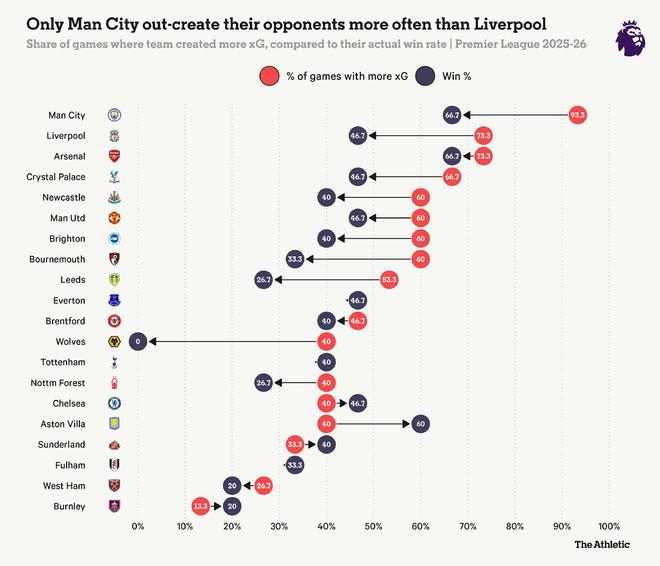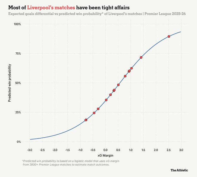近日,The Athletic發表專題文章,深入分析瞭利物浦本賽季在英超聯賽中面臨的核心矛盾:盡管球隊在超過八成的比賽中創造瞭比對手更多的得分機會(預期進球值占優),且該項數據高居歐洲前列,其實際聯賽排名卻僅列第十,與榜首差距達十分。文章通過系統對比歷史數據與比賽狀態分析指出,利物浦的困境遠非“運氣不佳”可簡單概括——球隊在落後時攻防失衡的戰術模式、關鍵局中微弱優勢的轉化乏力,以及與維拉等隊面對逆境時截然不同的比賽控制力,共同揭示瞭其“得勢難得分”的深層結構性癥結。