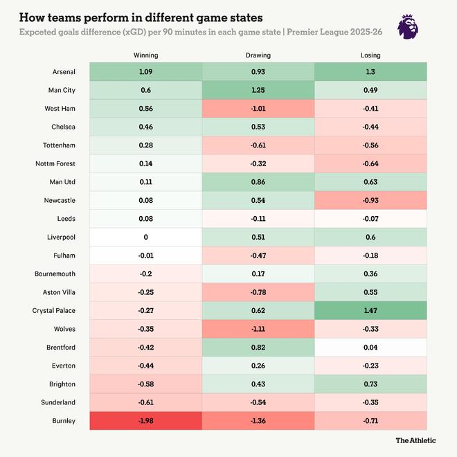 利物浦在追趕比賽時最具威脅,平均每90分鐘凈xG為0.6,但這些時段通常會演變成混亂的對攻戰。當他們落後時,進攻輸出從每90分鐘1.4 xG躍升至2.05 xG,但防守數據惡化,從0.89滑落至1.4。