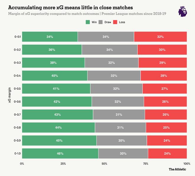 為瞭說明這一點,The Athletic研究瞭自2018-19賽季以來超過2800場英超比賽的xG差值,並將其與實際結果進行比較。當差值小於1時,xG更高的球隊獲勝的概率僅為46%,比拋硬幣的概率還低。
