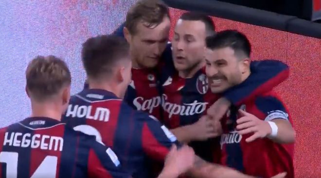 25年後國米又一次開場閃擊,有意思的是這次他們也未能笑到最後。落後的博洛尼亞隨後展開猛烈反撲,第21分鐘,博洛尼亞右路壓上,連續精妙的短傳配合,奧爾索利尼倒三角處回傳,貝爾納代斯基點球點處獲得很好的機會,隻是他兜射打的太正,門將馬丁內斯穩穩將球撲住。第31分鐘,博洛尼亞左路快速反擊,比塞克回防頭球解圍時出現低端失誤,竟然將球頂到自己手上。主裁親自觀看VAR後吹瞭點球,奧爾索利尼操刀主罰一蹴而就,博洛尼亞1:1扳平比分。