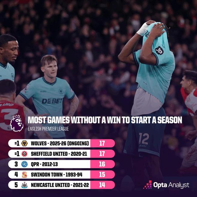 據統計,狼隊追平瞭謝菲爾德聯在2020-21賽季創下的英超開局最長不勝紀錄。
