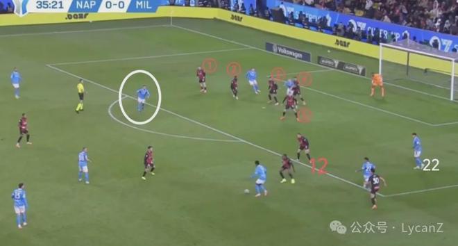 對手隻用霍伊倫和麥克托米奈兩人就把米蘭五個防守人員牽制在禁區內,原本跟防迪洛倫佐的拉比奧特也因為內雷斯的內切轉為協防站位。於是那不勒斯隊長空出來瞭,弧頂的埃爾馬斯無人限制,波利塔諾在輕松插上。